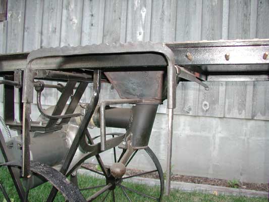 The forge has a PB50vs Centaur Forge www.centaurforge.com electric radial blower (this is one of the few electric forge blowers that has enough pressure to forge weld without flux) with variable speed control. It also has an air gate from Centaur Forge which is used to adjust the air rather than the variable speed control. The variable speed is usually set infrequently at the desired level of air and then the sliding air gate is used frequently to shut off the air and refine adjustment. The sliding air gate is operated by another 1/2” horizontally placed rod directly under the table top which can be reached from either side and pushed or pulled. The air gate slide is attached to the push pull rod by a small forged metal arm. Of course this forge could easily be used with a crank blower instead of an electric blower. Most good old crank blowers have enough pressure to forge weld without flux also if it is cranked fast enough.